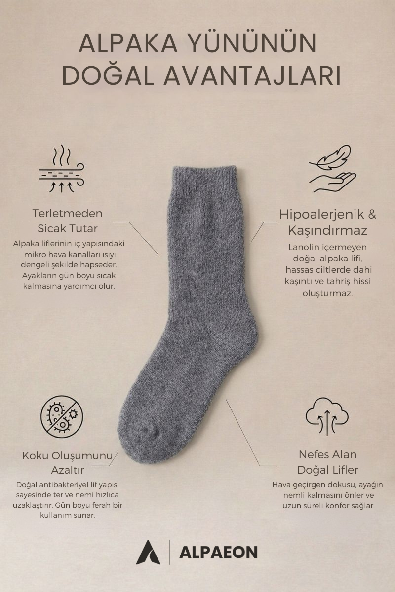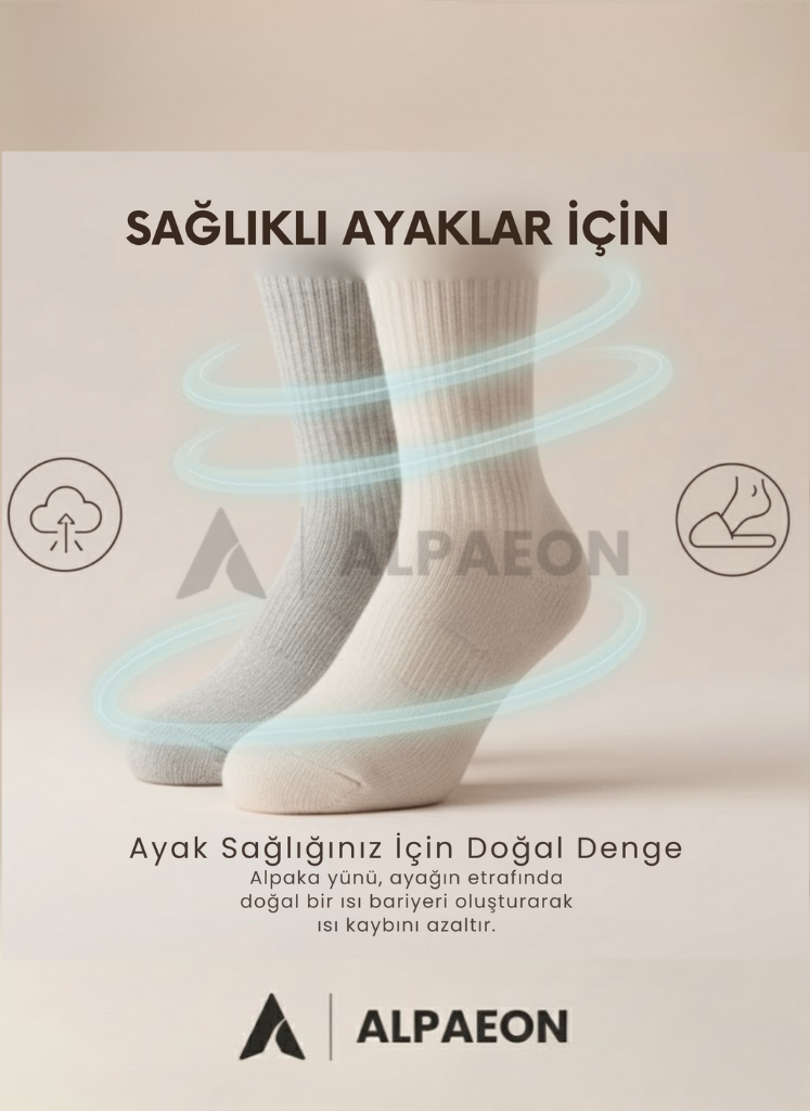 Alpaka yünü, ayağın etrafında doğal bir ısı bariyeri oluşturarak bu kaybı yavaşlatır.